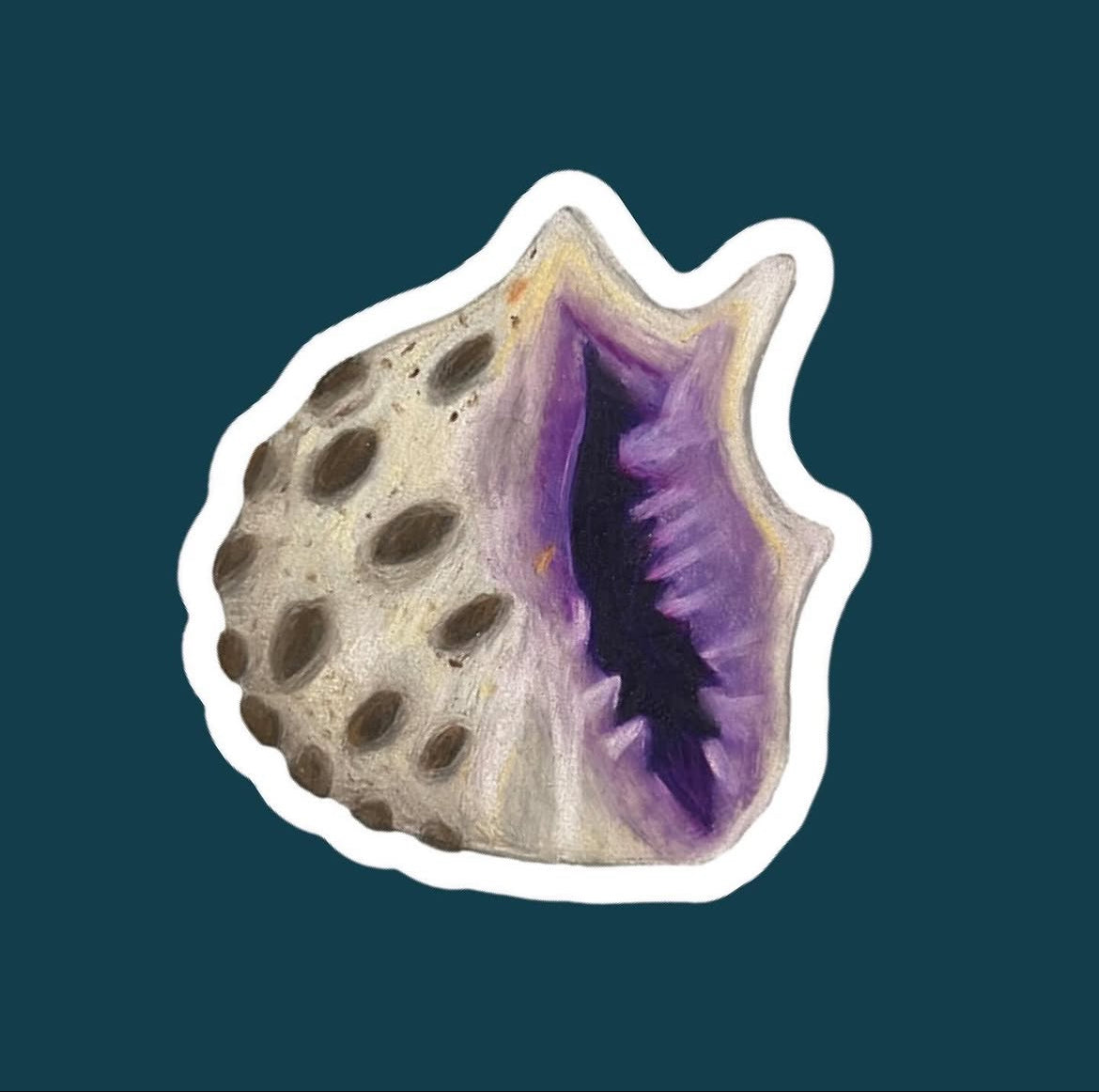 Put a pop of purple gear with this hand-drawn Drupa Shell sticker—illustrated in colored pencil to capture its natural, spiny details. Perfect for water bottles, laptops, sketchbooks, and more.
